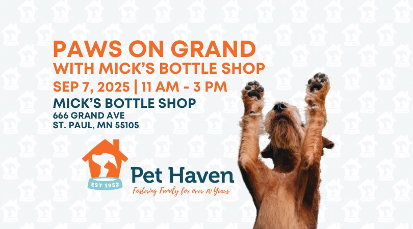 September 7 @ 11:00 am - 3:00 pm Pet Haven at Paws On Grand Meet & Greet Mick's Bottle Shop 666 Grand Avenue, St. Paul, MN, United States Mark your calendars for Saturday, September 21, 2024! Paws on Grand is back, Time to meet your new best friend at the Pet Haven booth. Grand Avenue in St. Paul will be transformed into a massive, festive block party for you and your furry best friend. Join thousands of pet lovers for a day of … Continued